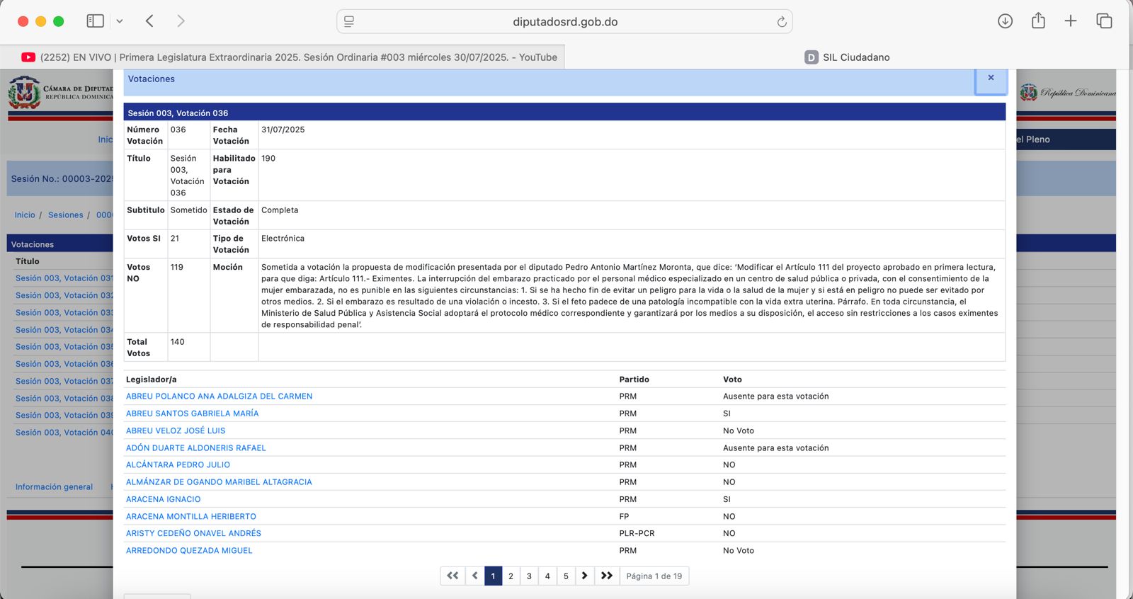 - Sesión 003, Votación 036. 30/07/2025