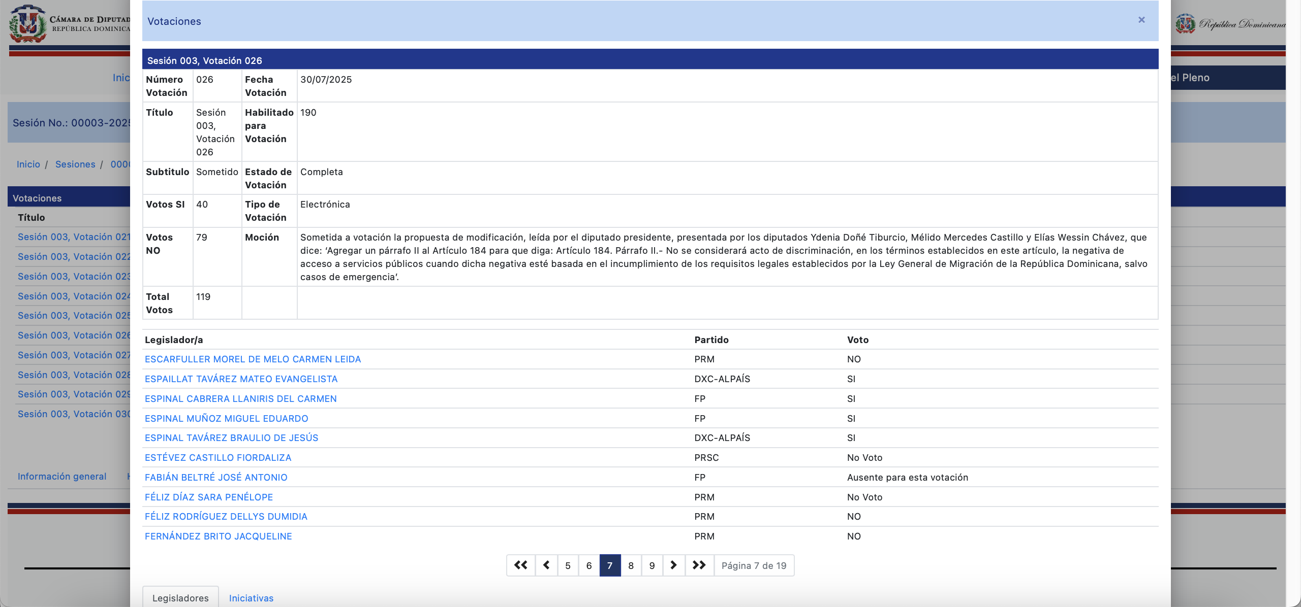 Votó NO en la propuesta presentada por los diputados Ydenia Doñé Tiburcio, Mélido Mercedes Castillo y Elías Wessin Chávez, que dice: ‘Agregar un párrafo II al Artículo 184 para que diga: Artículo 184. Párrafo II.- No se considerará acto de discriminación, en los términos establecidos en este artículo, la negativa de acceso a servicios públicos cuando dicha negativa esté basada en el incumplimiento de los requisitos legales establecidos por la Ley General de Migración de la República Dominicana, salvo casos de emergencia’.